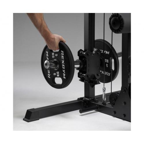 - Бесшумная и прочная система блоков гарантирует плавность и комфорт движений даже при значительных нагрузках. Нескользящая платформа для ног длиной 55 см и рукоятки для верхней и нижней тяги, крепящиеся с помощью прочной стальной цепи, обеспечивают стабильность и безопасность при тренировках , а максимальный вес на каждый узел штанги составляет 60–70 кг.