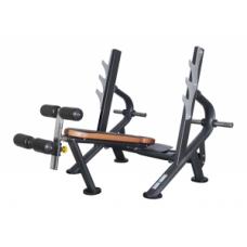 Скамья с отрицательным углом со стойками для жима штанги с упорм для ног и платформой для страхующего