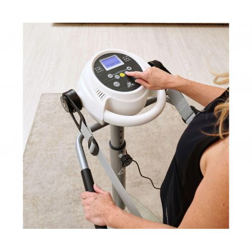 Тренажёр позволяет регулировать высоту массажного ремня в 5-ти положениях по вертикали. Массажёр VM25 работает на 20-ти разных скоростных режимах, которые вы сможете подобрать в зависимости от задач и области воздействия. Мотор постоянного тока мощностью 100 Ватт. Есть 6 встроенных режимов тренировки, а также ручной, обратный отсчёт времени и калорий.