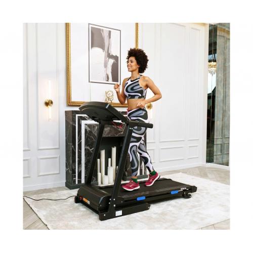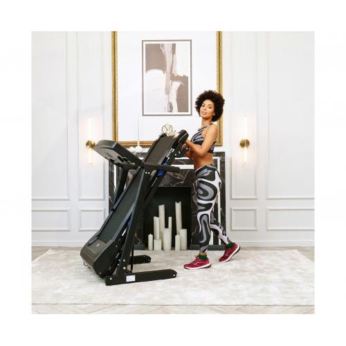 Дорожка имеет складную конструкцию для экономии жизненного пространства с помощью гидроцилиндра, и встроенные колеса для перемещения дорожки после тренировки.